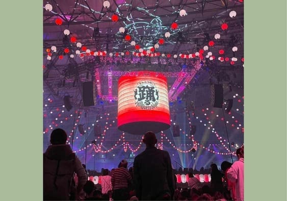 屋台が並び、盆踊りのような櫓ステージに音楽と光の演出✨